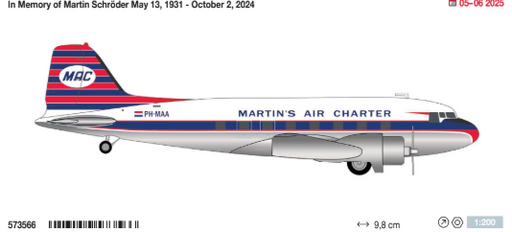 573566 | Herpa Wings 1:200 | Martin‘s Air Charter Douglas DC-3 – PH-MAA | is due April 2025